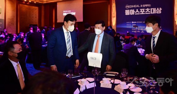 스포츠동아가 동아일보, 채널A, 메디힐과 공동으로 주최하고 국내 5대 프로스포츠(프로야구·프로축구·남녀프로농구·남녀프로배구·남녀프로골프) 종목별로 올 한해를 빛낸 최고의 선수를 선정하는 ‘메디힐 함께하는 2022 동아스포츠대상‘ 시상식이 5일 서울 중구 롯데호텔서울 크리스탈볼룸에서 개최됐다. 시상식에 앞서 허구연 KBO 총재가 삼성 박진만, 두산 이승엽, KIA 김종국 감독과 이야기를 하고 있다.