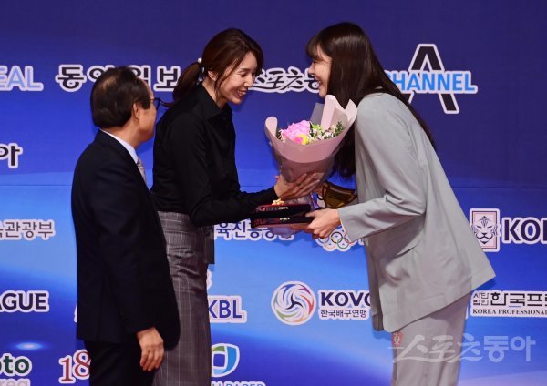 스포츠동아가 동아일보, 채널A, 메디힐과 공동으로 주최하고 국내 5대 프로스포츠(프로야구·프로축구·남녀프로농구·남녀프로배구·남녀프로골프) 종목별로 올 한해를 빛낸 최고의 선수를 선정하는 ‘메디힐과 함께하는 2022 동아스포츠대상‘ 시상식이 5일 서울 중구 롯데호텔서울 크리스탈볼룸에서 개최됐다. 여자프로농구 올해의 선수상을 수상한 박지수(KB스타즈)가 이병완 한국여자농구연맹(WKBL) 총재, 정진경 한국여자농구연맹(WKBL) 경기본부장으로부터 트로피와 꽃다발을 받고 있다.