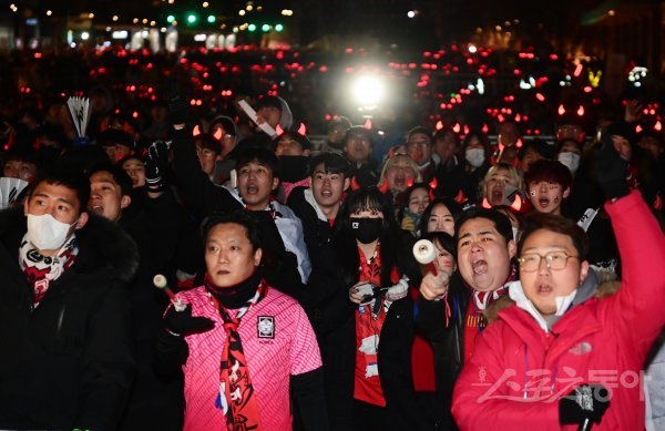 6일 서울 광화문광장에서 열린 ‘2022 카타르 월드컵’ 한국과 브라질의 16강전 경기 승리를 기원하는 시민들이 브라질의 반칙에 손짓하고 있다.