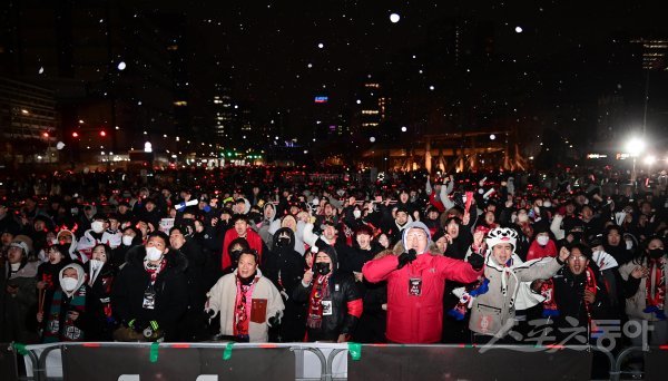 6일 서울 광화문광장에서 열린 ‘2022 카타르 월드컵’ 한국과 브라질의 16강전 경기 승리를 기원하는 시민들이 골찬스에 환호하고 있다.