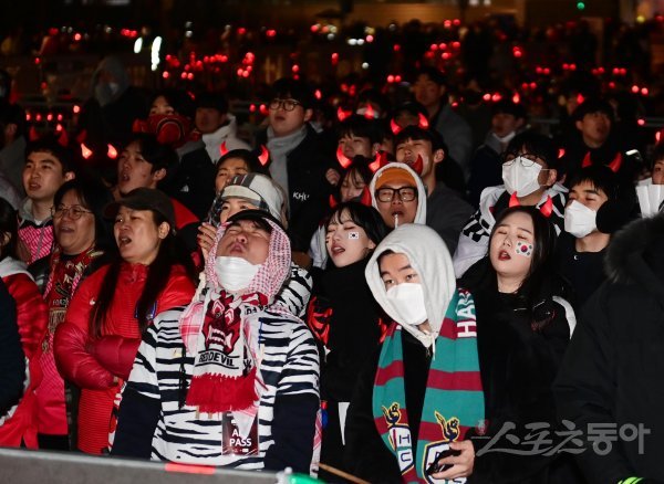 6일 서울 광화문광장에서 열린 ‘2022 카타르 월드컵’ 한국과 브라질의 16강전 경기 승리를 기원하는 시민들이 네 번째 실점에 아쉬워하고 있다.