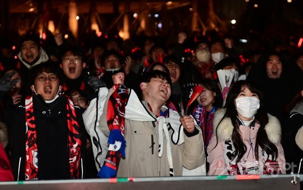6일 서울 광화문광장에서 열린 ‘2022 카타르 월드컵’ 한국과 브라질의 16강전 경기 승리를 기원하는 시민들이 빗나간 슈팅에 아쉬워하고 있다.