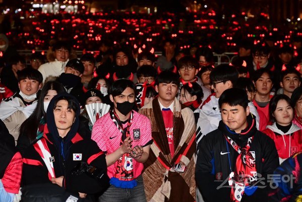 6일 서울 광화문광장에서 열린 ‘2022 카타르 월드컵’ 한국과 브라질의 16강전 경기 승리를 기원하는 시민들이 실점에 아쉬워하고 있다.