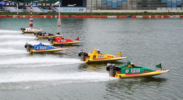 미사리경정장에서 선수들이 플라잉스타트로 경주를 출발하고 있다.