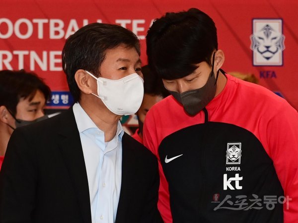 ‘2022 카타르 월드컵’ 16강을 거둔 한국축구대표팀이 7일 인천국제공항 1터미널을 통해 귀국해 축하행사를 하고 있다. 정몽규 대한축구협회 회장과 한국 손흥민이 이야기를 하고 있다.