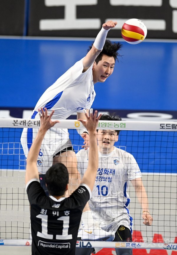 7일 천안 유관순체육관에서 열린 ‘2022~2023 도드람 V-리그’ 남자부 현대캐피탈과 삼성화재 경기에서 삼성화재 김준우가 현대캐피탈의 블로킹 사이로 스파이크를 날리고 있다.