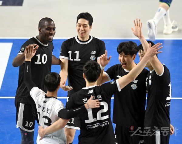 7일 천안 유관순체육관에서 열린 ‘2022~2023 도드람 V-리그’ 남자부 현대캐피탈과 삼성화재 경기에서 현대캐피탈 선수들이 팀 서브 득점에 기뻐하고 있다.
