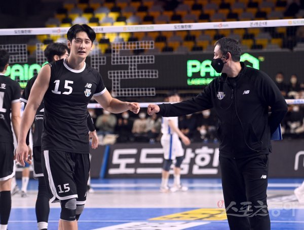 7일 천안 유관순체육관에서 열린 ‘2022~2023 도드람 V-리그’ 남자부 현대캐피탈과 삼성화재 경기에서 현대캐피탈 문성민이 3세트 공격 득점에 성공한 후 최태웅 감독과 주먹을 맞대고 있다.
