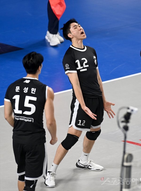 7일 천안 유관순체육관에서 열린 ‘2022~2023 도드람 V-리그’ 남자부 현대캐피탈과 삼성화재 경기에서 현대캐피탈 전광인이 서브 득점에 성공한 후 기뻐하고 있다.