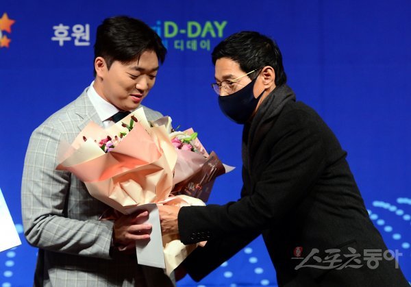 8일 서울 청담동 리베라호텔에서 열린 ‘2022 뉴트리데이 일구상 시상식’에 참석한 LG 고우석이 최고투수상을 수상 후 염경엽 감독의 축하를 받고 있다.