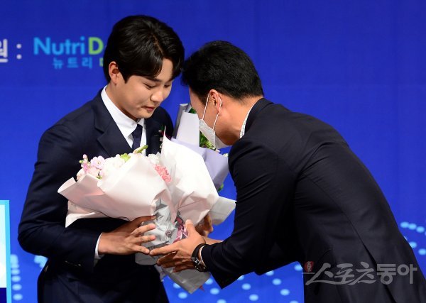 8일 서울 청담동 리베라호텔에서 열린 ‘2022 뉴트리데이 일구상 시상식’에 참석한 두산 정철원이 신인상을 수상 후 이승엽 감독의 축하꽃다발을 받고 있다.