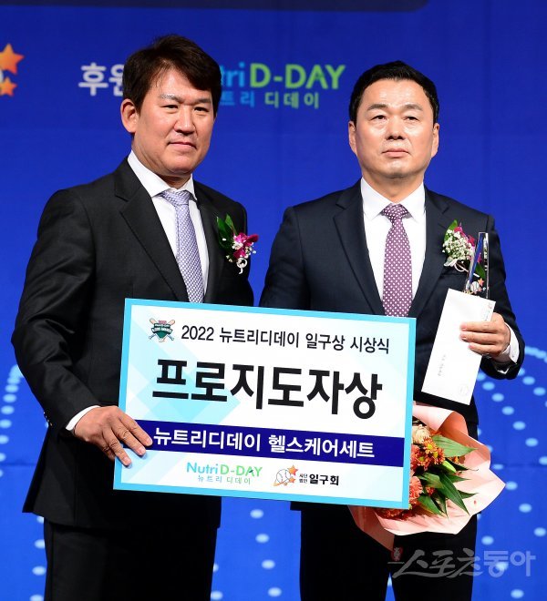 8일 서울 청담동 리베라호텔에서 열린 ‘2022 뉴트리데이 일구상 시상식’에 참석한 박치왕 상무 감독이 프로지도자상을 수상 후 기념촬영을 하고 있다.
