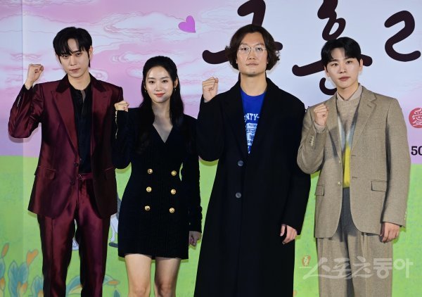 배우 김영대, 박주현, 감독 박상우, 김우석이 8일 서울 용산구 CGV용산아이파크몰점에서 열린 MBC 새 금토드라마 ‘금혼령, 조선 혼인 금지령’ 제작발표회에서 포즈를 취하고 있다.