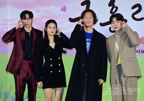 배우 김영대, 박주현, 감독 박상우, 김우석이 8일 서울 용산구 CGV용산아이파크몰점에서 열린 MBC 새 금토드라마 ‘금혼령, 조선 혼인 금지령’ 제작발표회에서 포즈를 취하고 있다.