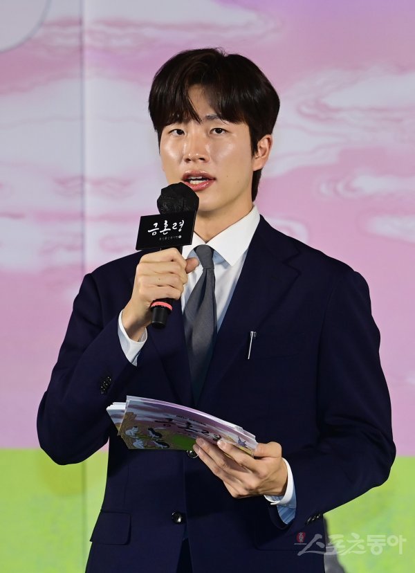 아나운서 정영한이 8일 서울 용산구 CGV용산아이파크몰점에서 열린 MBC 새 금토드라마 ‘금혼령, 조선 혼인 금지령’ 제작발표회에서 MC를 맡아 진행하고 있다.
