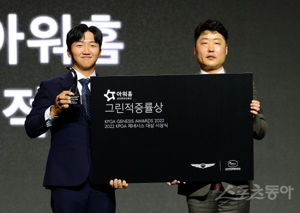 8일 서울 삼성동 그랜드인터컨티넨탈호텔에서 열린 ‘2022 KPGA 제네시스 대상’ 시상식에 참석한 김홍택 프로가 아워홈 그린적중률상을 수상 후 아워홈 이상욱 팀장과 기념촬영을 하고 있다.