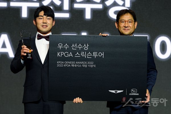 8일 서울 삼성동 그랜드인터컨티넨탈호텔에서 열린 ‘2022 KPGA 제네시스 대상’ 시상식에 참석한 김상현 프로가 KPGA 스릭슨투어 우수 선수상을 수상 후 기념촬영을 하고 있다.