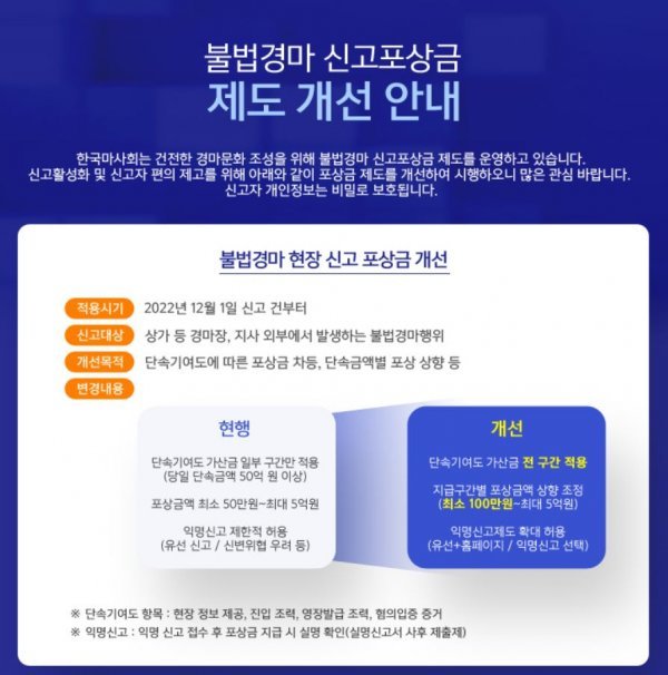 한국마사회는 불법경마 신고 포상제도를 개편했다. 우선, 불법경마 현장(영업장 외부) 단속 기여도에 따른 가산금을 당일 단속금액 50억 원 이상으로 한정하지 않고 전 금액 구간으로 확대했다. 최소 포상금도 2배 올려 단속금액에 따라 최소 100만 원에서 최대 5억 원까지 지급한다. 객장(영업장 내부) 단속은 최대 포상금액을 1인당 60만 원으로 높였다. 불법 이용되는 계좌신고도 1건당 30만 원을 추가 지급하기로 했다. 개편 내용은 12월 1일 신고 건부터 적용된다. 불법경마사이트 신고 포상금도 기존 1건당 10만 원 지급과는 별개로 불법이용 계좌신고 1건 당 30만 원을 추가 지급하고 있다.