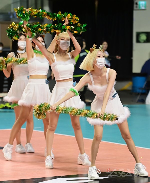 8일 서울 장충체육관에서 열린 ‘2022-2023 도드람 V-리그’ 여자부 서울 GS칼텍스와 수원 현대건설의 경기에서 GS칼텍스 치어리더들이 공연을 펼치고 있다.