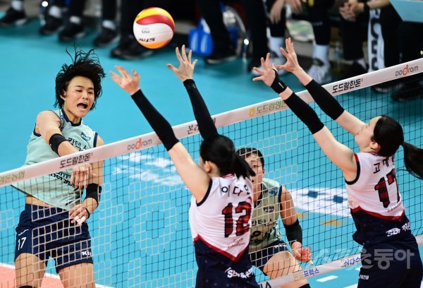 8일 서울 장충체육관에서 열린 ‘2022-2023 도드람 V-리그’ 여자부 서울 GS칼텍스와 수원 현대건설의 경기에서 GS칼텍스 문지윤이 현대건설 블로커 앞에서 스파이크를 하고 있다.