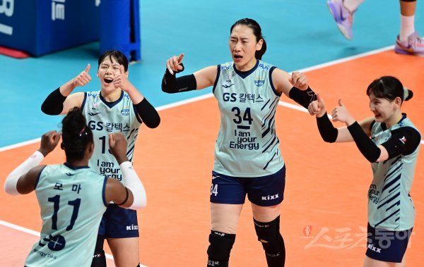 8일 서울 장충체육관에서 열린 ‘2022-2023 도드람 V-리그’ 여자부 서울 GS칼텍스와 수원 현대건설의 경기에서 득점에 성공한 GS칼텍스 선수들이 기쁨을 나누고 있다.
