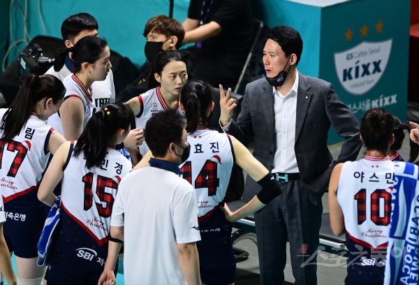 8일 서울 장충체육관에서 열린 ‘2022-2023 도드람 V-리그’ 여자부 서울 GS칼텍스와 수원 현대건설의 경기에서 현대건설 강성형 감독이 선수들에게 작전 지시를 하고 있다.