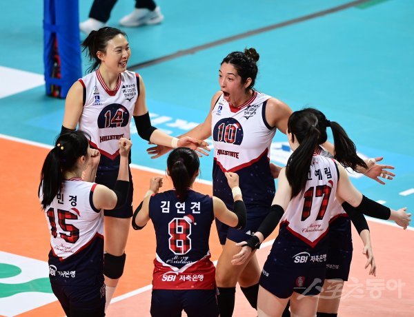 8일 서울 장충체육관에서 열린 ‘2022-2023 도드람 V-리그’ 여자부 서울 GS칼텍스와 수원 현대건설의 경기에서 득점에 성공한 현대건설 선수들이 기쁨을 나누고 있다.