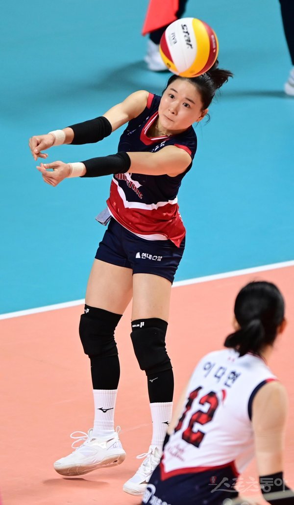 8일 서울 장충체육관에서 열린 ‘2022-2023 도드람 V-리그’ 여자부 서울 GS칼텍스와 수원 현대건설의 경기에서 현대건설 김연견이 리시브를 하고 있다.