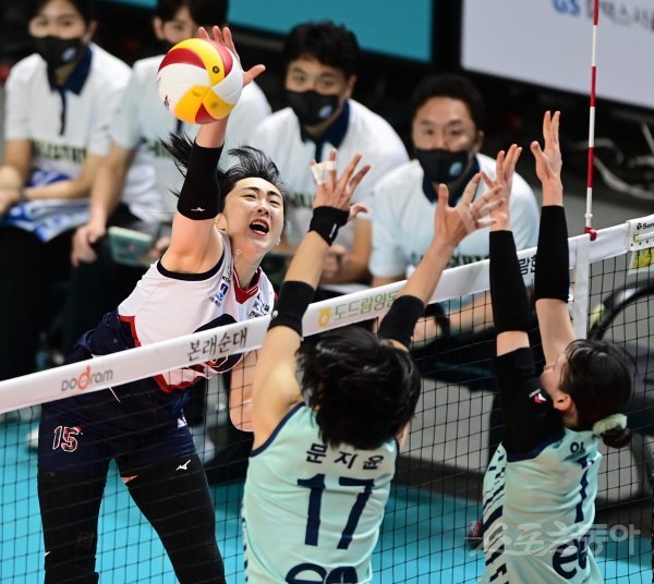8일 서울 장충체육관에서 열린 ‘2022-2023 도드람 V-리그’ 여자부 서울 GS칼텍스와 수원 현대건설의 경기에서 현대건설 황민경이 GS칼텍스 블로커 앞에서 스파이크를 하고 있다.