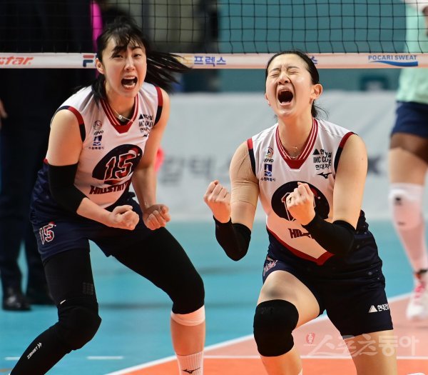 8일 서울 장충체육관에서 열린 ‘2022-2023 도드람 V-리그’ 여자부 서울 GS칼텍스와 수원 현대건설의 경기에서 블로킹 득점에 성공한 현대건설 이다현이 포효하고 있다.