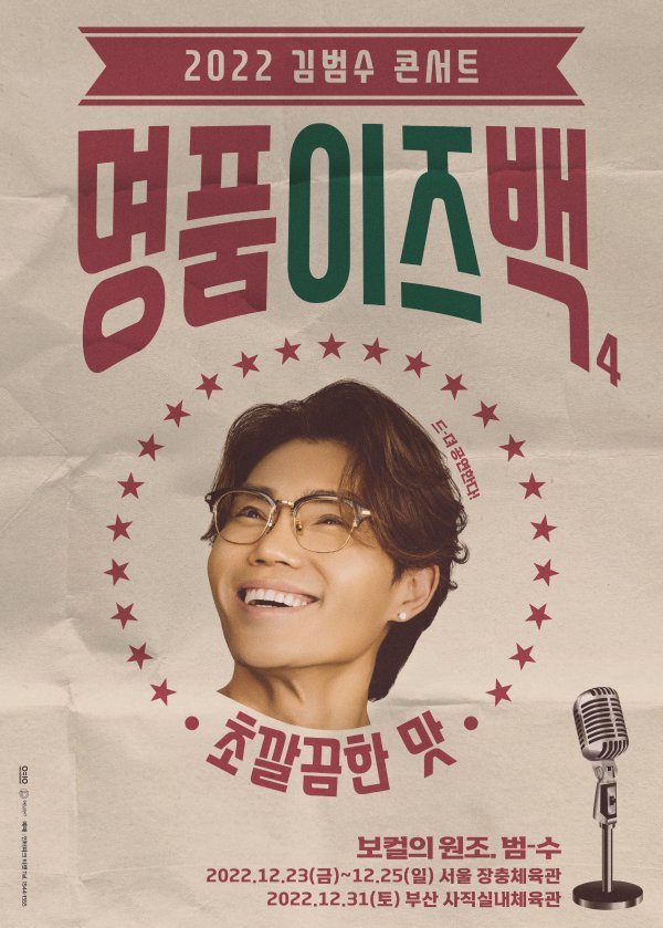 김범수는 오는 123일부터 25일까지 3일간 서울 장충체육관, 31일 부산 사직실내체육관에서 ‘2022 김범수 콘서트 ‘명품이즈백’’을 개최한다.