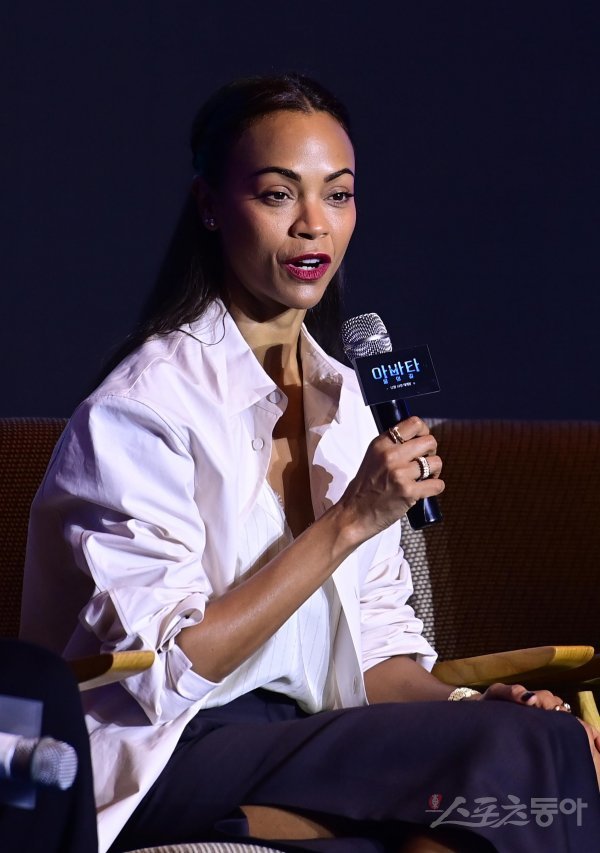 조 샐다나가 9일 서울 영등포구 여의도 콘래드서울에서 열린 영화 ‘아바타: 물의 길’ 내한 기자간담회에서 인사말을 하고 있다.