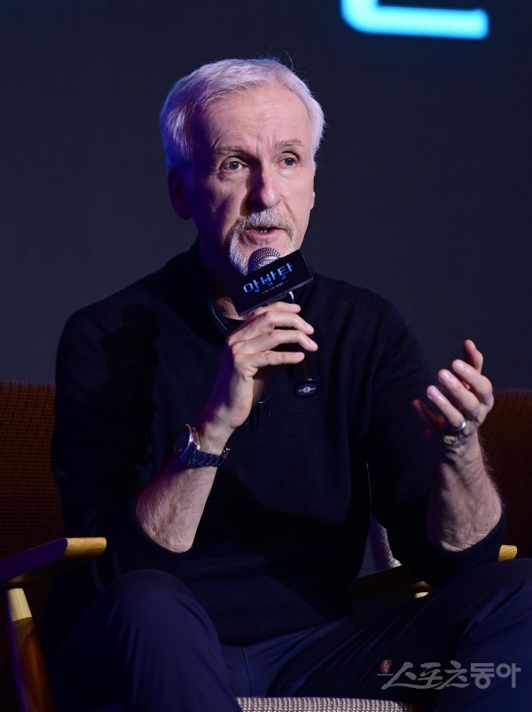제임스 카메론 감독이 9일 서울 영등포구 여의도 콘래드서울에서 열린 영화 ‘아바타: 물의 길’ 내한 기자간담회에서 취재진의 질문에 답하고 있다.