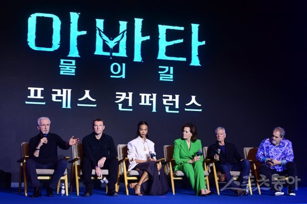 제임스 카메론 감독이 9일 서울 영등포구 여의도 콘래드서울에서 열린 영화 ‘아바타: 물의 길’ 내한 기자간담회에서 취재진의 질문에 답하고 있다.
