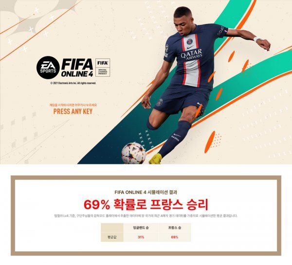 인기게임 ‘피파온라인4’의 감독모드 플레이 빅데이터 분석 결과는 프랑스가 잉글랜드에 승리할 가능성이 69%로 집계돼 비교적 우위에 있는 것으로 나타났다.