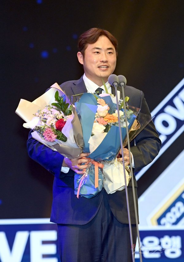 ‘2022 신한은행 SOL KBO리그’ 골든글러브 시상식이 9일 서울 코엑스 오디토리움에서 개최됐다. 페어플레이상을 수상한 키움 이지영이 수상 소감을 말하고 있다.