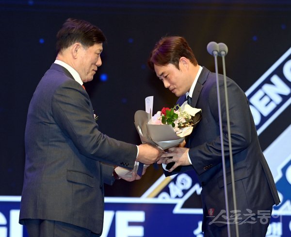 ‘2022 신한은행 SOL KBO리그’ 골든글러브 시상식이 9일 서울 코엑스 오디토리움에서 개최됐다. 키움 이지영이 허구연 총재에게 페어플레이상을 수상하고 있다.