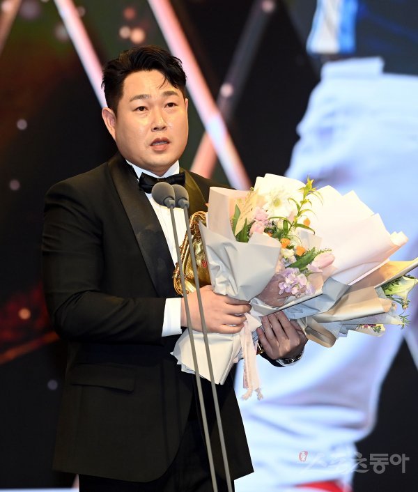 ‘2022 신한은행 SOL KBO리그’ 골든글러브 시상식이 9일 서울 코엑스 오디토리움에서 개최됐다. 포수 부문 골든글러브를 수상한 두산 양의지가 수상 소감을 말하고 있다.
