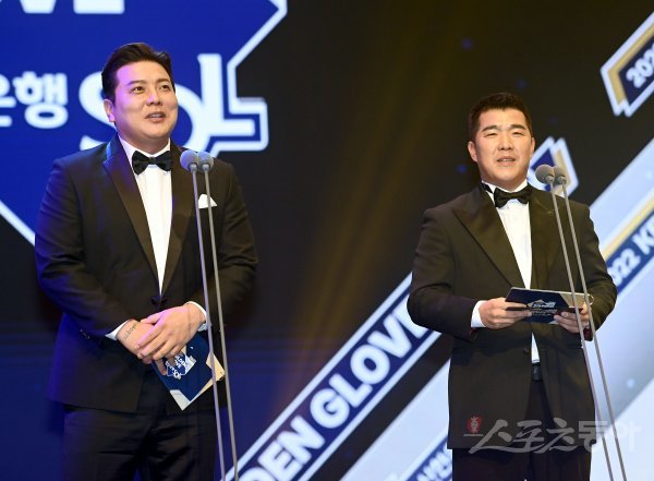‘2022 신한은행 SOL KBO리그’ 골든글러브 시상식이 9일 서울 코엑스 오디토리움에서 개최됐다. 김태균과 정근우가 수상자를 발표하고 있다.