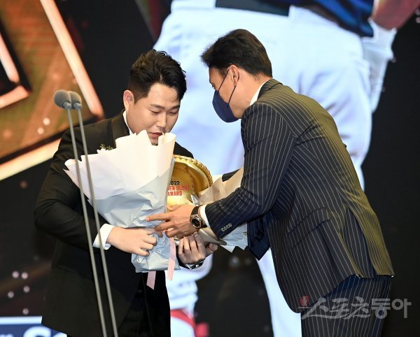 ‘2022 신한은행 SOL KBO리그’ 골든글러브 시상식이 9일 서울 코엑스 오디토리움에서 개최됐다. 포수 부문 골든글러브를 수상한 두산 양의지가 이승엽 감독의 축하를 받고 있다.