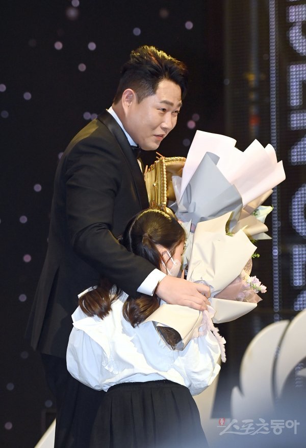 ‘2022 신한은행 SOL KBO리그’ 골든글러브 시상식이 9일 서울 코엑스 오디토리움에서 개최됐다. 포수 부문 골든글러브를 수상한 두산 양의지가 딸의 축하를 받고 있다.