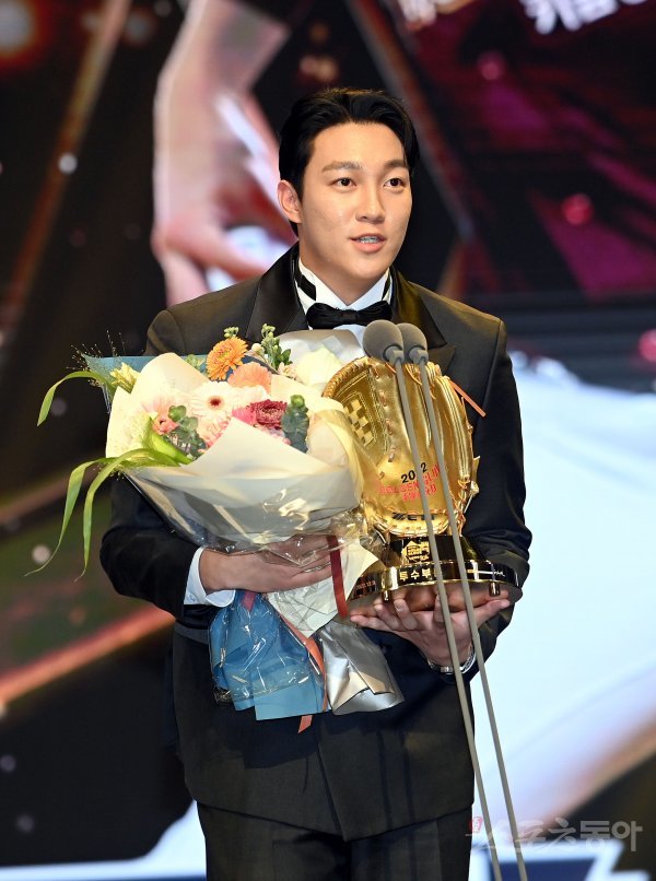 ‘2022 신한은행 SOL KBO리그’ 골든글러브 시상식이 9일 서울 코엑스 오디토리움에서 개최됐다. 투수 부문 골든글러브를 수상한 키움 안우진이 수상 소감을 말하고 있다.
