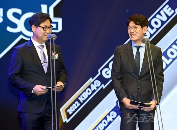 ‘2022 신한은행 SOL KBO리그’ 골든글러브 시상식이 9일 서울 코엑스 오디토리움에서 개최됐다. 이만수 전 감독과 KT 이강철 감독이 수상자를 발표하고 있다.