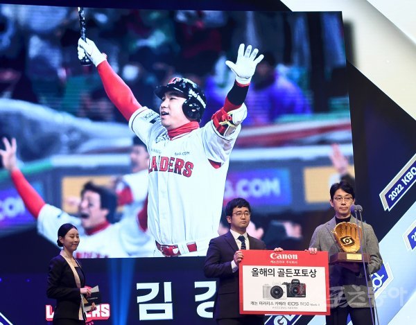‘2022 신한은행 SOL KBO리그’ 골든글러브 시상식이 9일 서울 코엑스 오디토리움에서 개최됐다. 한국스포츠사진기자협회가 선정한 골든포토상을 SSG 김강민이 수상했다. SSG 랜더스 맹수환 홍보팀장이 대리수상을 하고 있다.