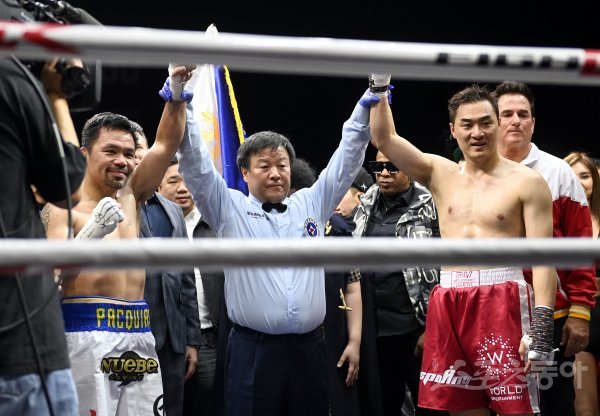필리핀 복싱 영웅 매니 파퀴아오와 다양한 무술을 구사하는 인플루언서 DK YOO(유대경)의 스페셜 매치가 11일 경기도 고양 일산킨텍스에서 열렸다. 매니 파퀴아오와 유대경이 경기를 마치고 기념촬영을 하고 있다.