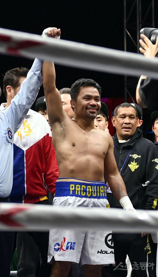 필리핀 복싱 영웅 매니 파퀴아오와 다양한 무술을 구사하는 인플루언서 DK YOO(유대경)의 스페셜 매치가 11일 경기도 고양 일산킨텍스에서 열렸다. 심판이 파퀴아오의 손을 들고 있다.