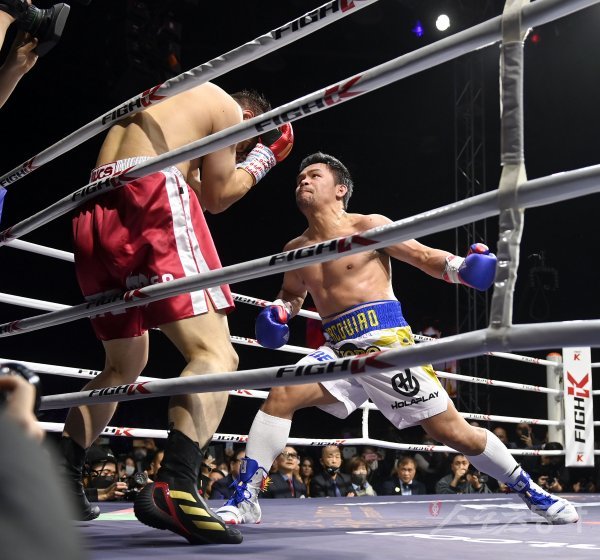 필리핀 복싱 영웅 매니 파퀴아오와 다양한 무술을 구사하는 인플루언서 DK YOO(유대경)의 스페셜 매치가 11일 경기도 고양 일산킨텍스에서 열렸다. 매니 파퀴아오가 강력한 펀치를 날리고 있다.
