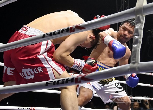 필리핀 복싱 영웅 매니 파퀴아오와 다양한 무술을 구사하는 인플루언서 DK YOO(유대경)의 스페셜 매치가 11일 경기도 고양 일산킨텍스에서 열렸다. 매니 파퀴아오가 강력한 펀치를 날리고 있다.