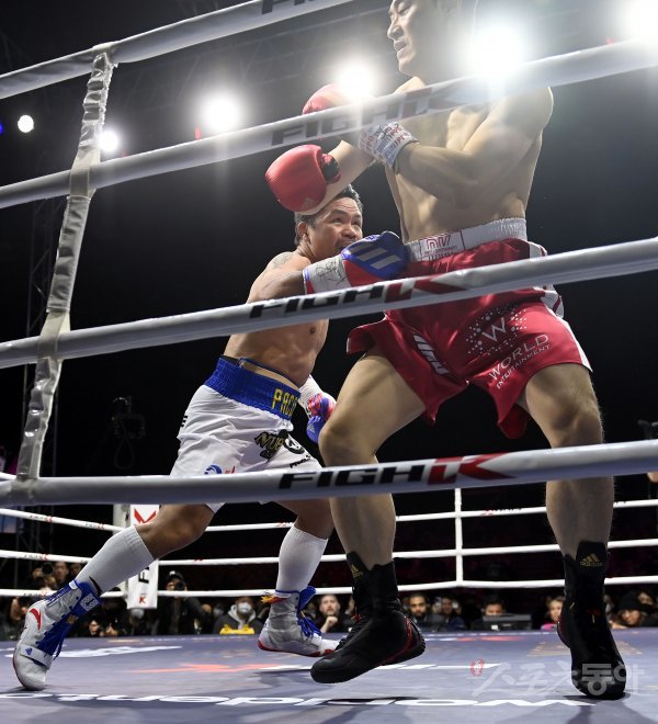 필리핀 복싱 영웅 매니 파퀴아오와 다양한 무술을 구사하는 인플루언서 DK YOO(유대경)의 스페셜 매치가 11일 경기도 고양 일산킨텍스에서 열렸다. 매니 파퀴아오가 강력한 펀치를 날리고 있다.