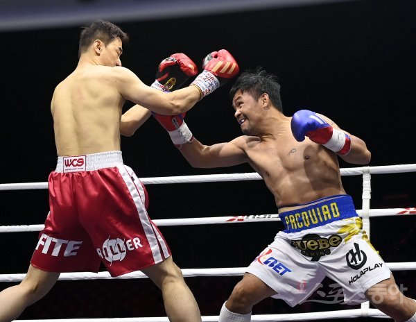필리핀 복싱 영웅 매니 파퀴아오와 다양한 무술을 구사하는 인플루언서 DK YOO(유대경)의 스페셜 매치가 11일 경기도 고양 일산킨텍스에서 열렸다. 매니 파퀴아오가 강력한 펀치를 날리고 있다.